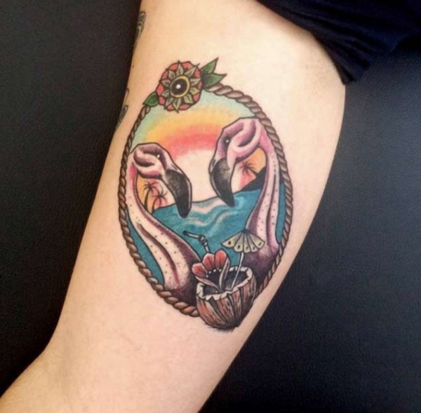 手臂有趣的丰富多彩火烈鸟夫妇纹身图案