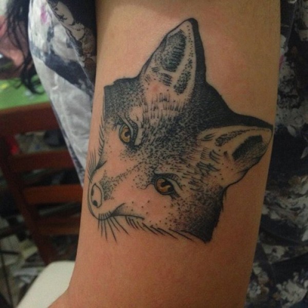 old school令人难以置信的黄眼睛狼头点刺手臂纹身图案