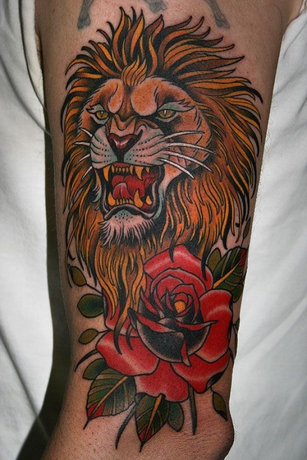 old school彩色的狮子头和红玫瑰手臂纹身图案