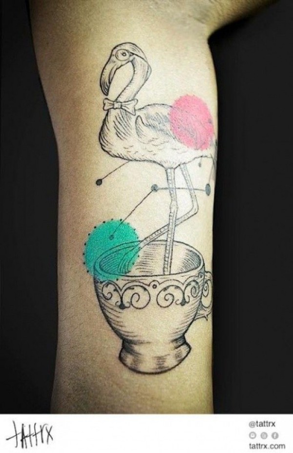 手臂有趣的火烈鸟茶杯和五彩圆圈纹身图案
