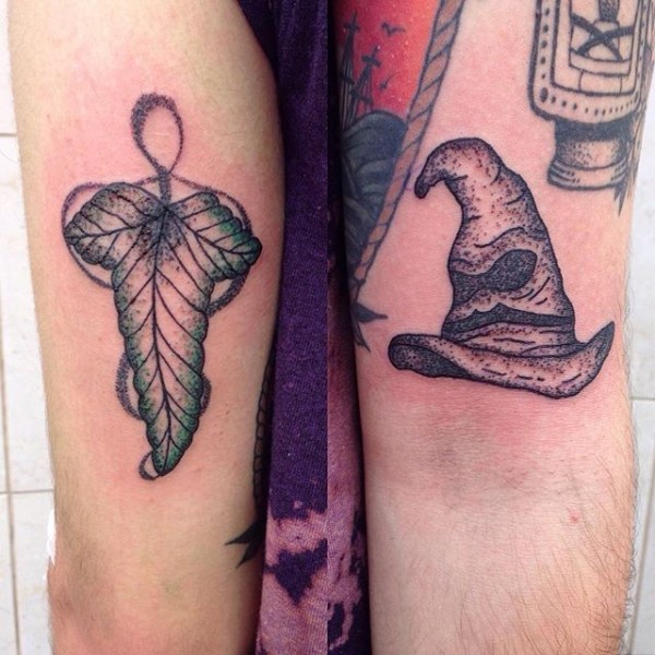 手臂微小的黑色点刺魔术帽与叶子纹身图案