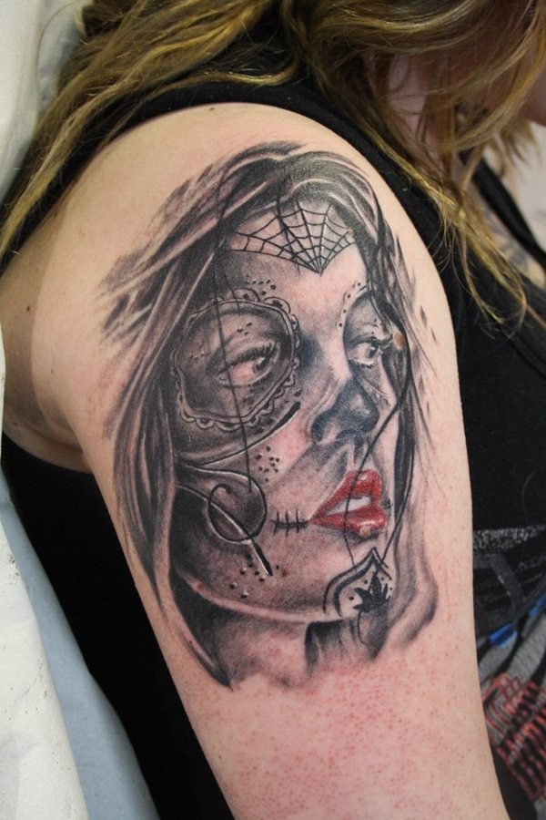 女生手臂墨西哥风格的女性肖像彩色纹身图案