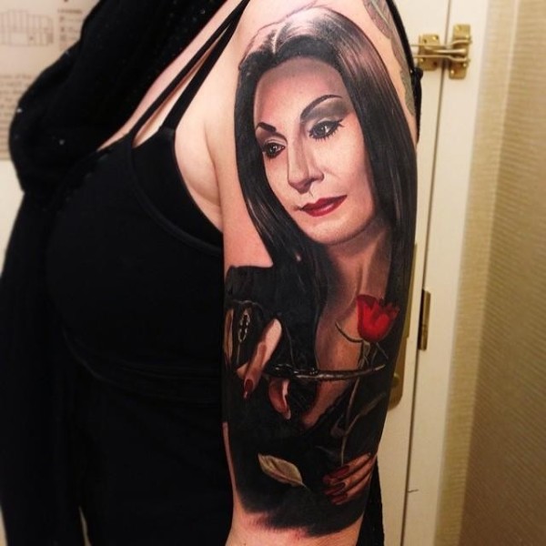 手臂美妙的写实彩色女性肖像与剪刀玫瑰纹身图案