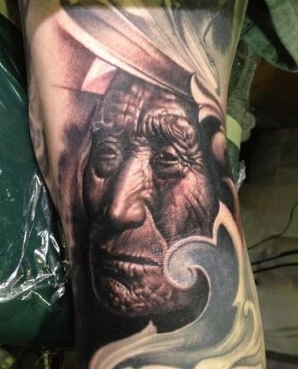 手臂写实的黑白印度老人肖像纹身图案