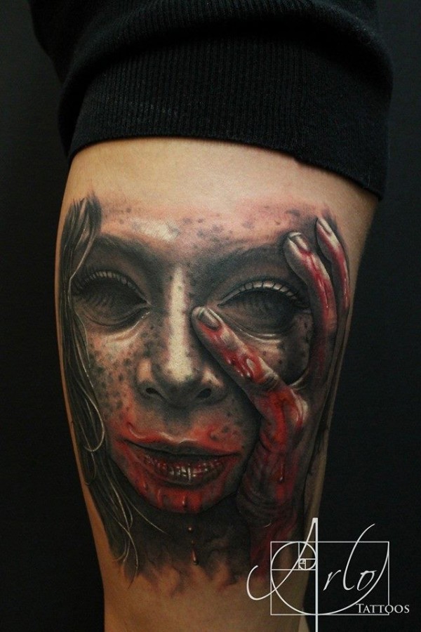 手臂恐怖的彩色血腥恶魔女人肖像纹身图案