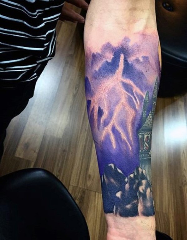 美丽的紫色小闪电与城堡手臂纹身图案