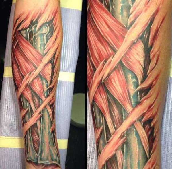 非常逼真的彩色骨骼和肌肉手臂纹身图案