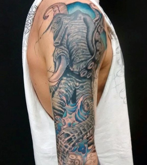 不寻常的风格五彩半象半章鱼手臂纹身图案