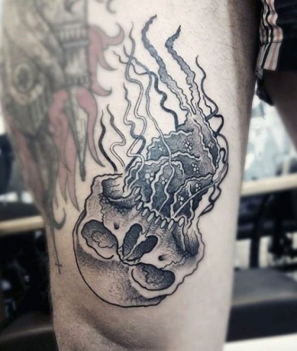 手臂很酷的黑色点刺骷髅形状水母纹身图案
