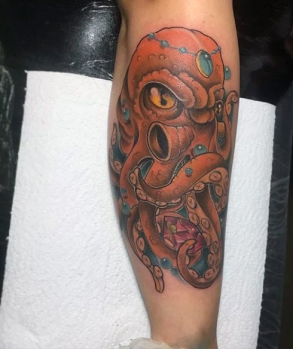 手臂卡通风格彩色的愤怒章鱼纹身图案