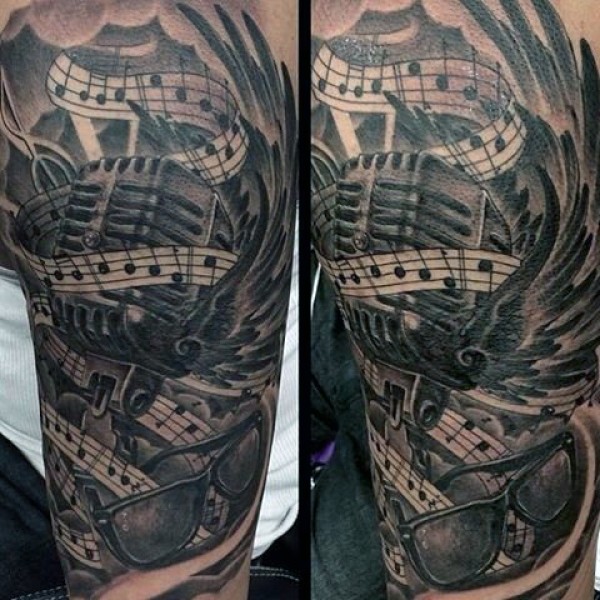 黑白麦克风与五线谱和眼镜手臂纹身图案