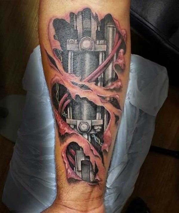 非常逼真的彩色机械与撕皮手臂纹身图案