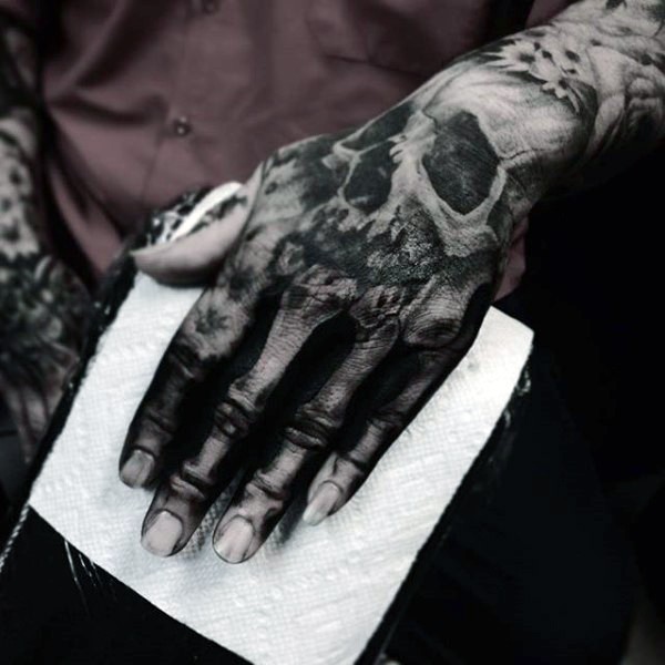 手背令人毛骨悚然的黑白骷髅骨架纹身图案