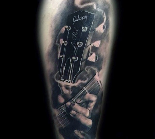 灿烂的音乐主题黑白吉他手臂纹身图案
