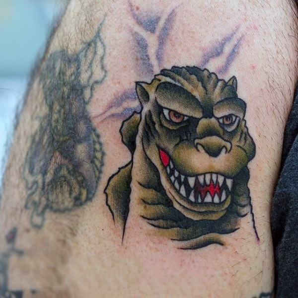 卡通风格的哥斯拉头像手臂纹身图案