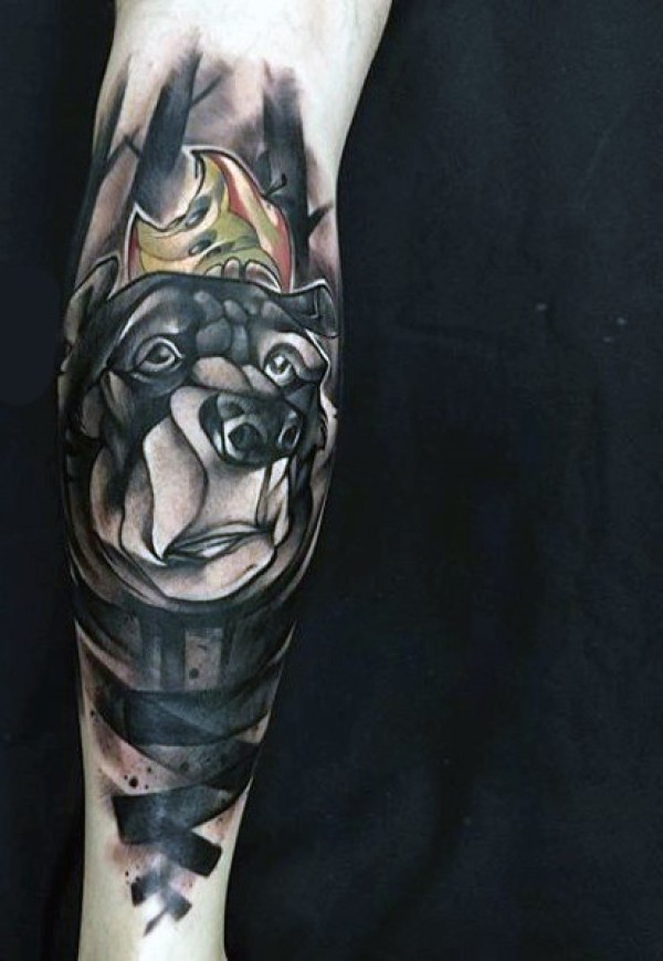 手臂令人印象深刻的彩色苹果和熊纹身图案