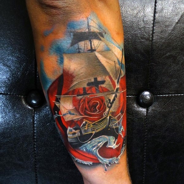 美丽的彩色小船和波浪玫瑰手臂纹身图案