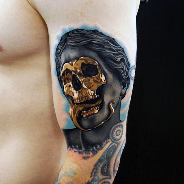 很棒的设计神秘雕像与黄金骷髅手臂纹身图案
