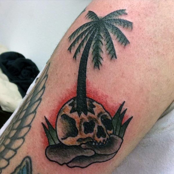 有趣的设计彩色小棕榈树与骷髅手臂纹身图案