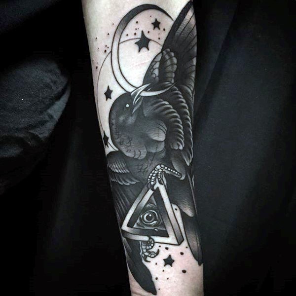 手臂独特的黑白乌鸦和月亮眼睛三角形纹身图案