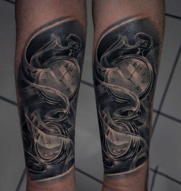 写实的黑白怀表手臂纹身图案