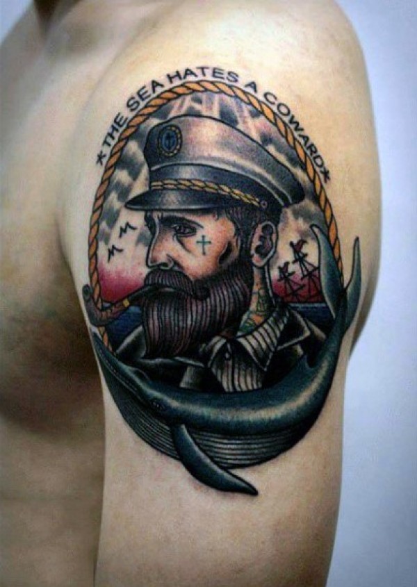 手臂华丽的彩色字母和老水手鲸鱼纹身图案