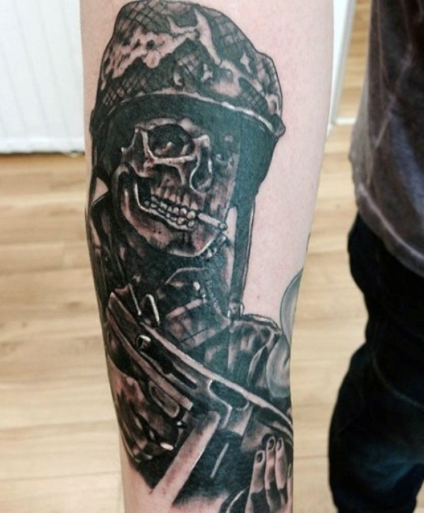 独特设计的黑白吸烟骷髅士兵手臂纹身图案