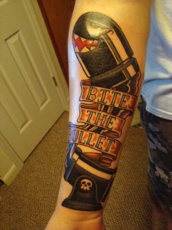 手臂华丽的彩色字母与子弹卡通纹身图案
