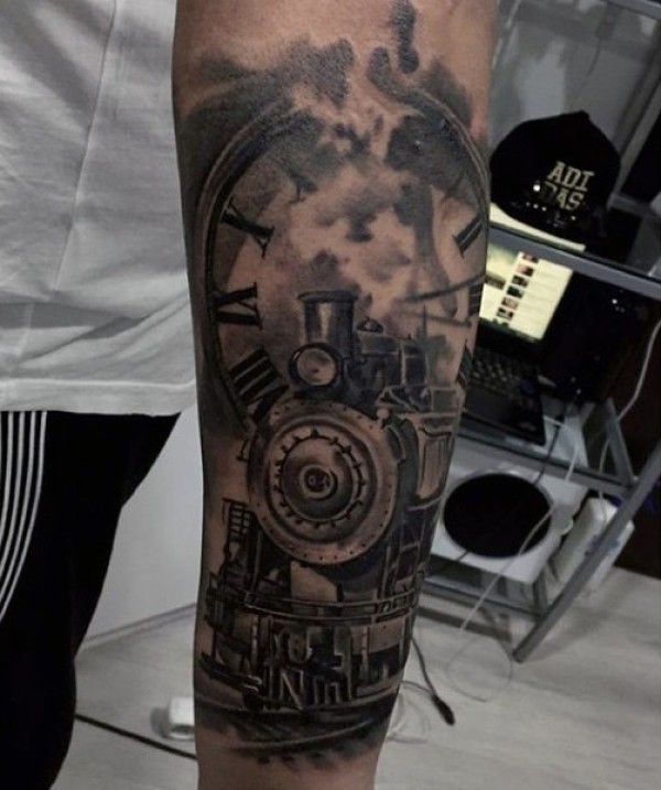 华丽的黑色蒸汽火车和时钟手臂纹身图案