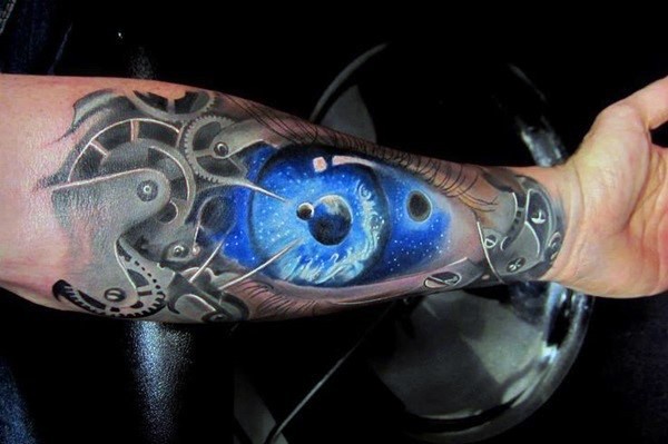 令人印象深刻的未来星空和机械齿轮手臂纹身图案