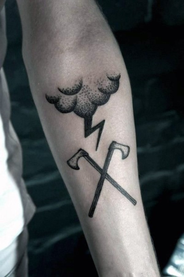 一对交叉斧头和闪电云朵点刺手臂纹身图案