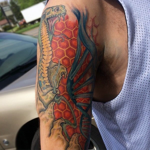 手臂华丽彩绘彩色蛇与DNA符号纹身图案
