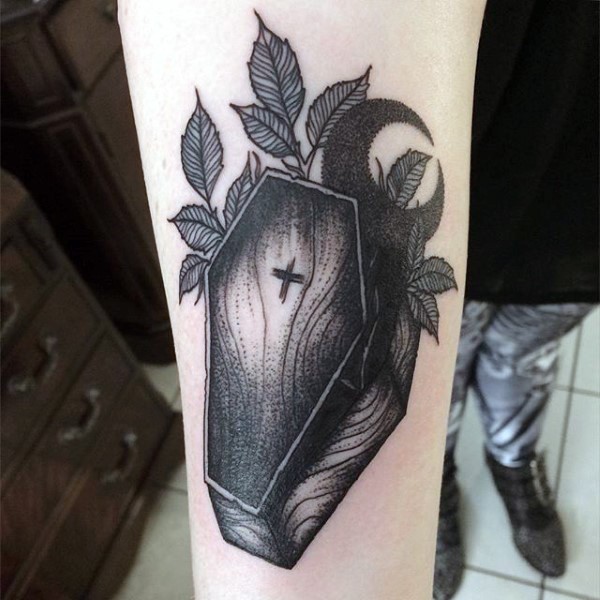 手臂简单的小棺材与十字架和月亮纹身图案