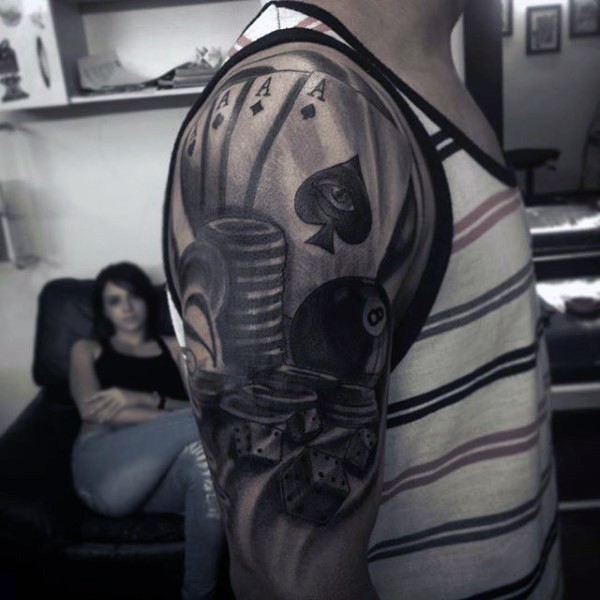 赌博主题黑色扑克牌和骰子手臂纹身图案