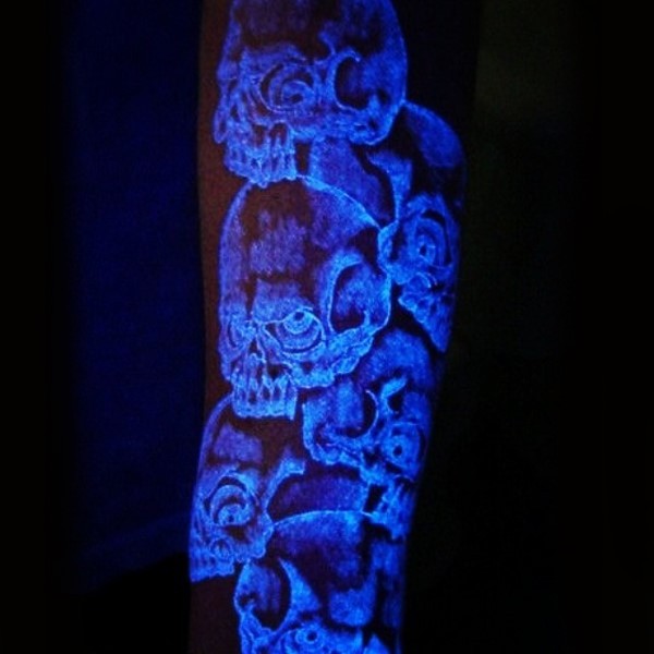 手臂独特设计的一群荧光疯狂骷髅纹身图案
