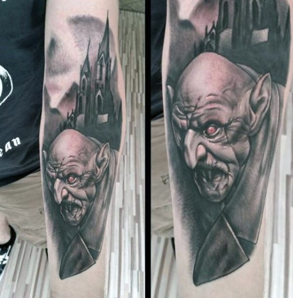手臂很棒的彩色夜晚城市怪物纹身图案