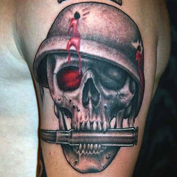 手臂军事主题的彩色士兵头骨与子弹纹身图案