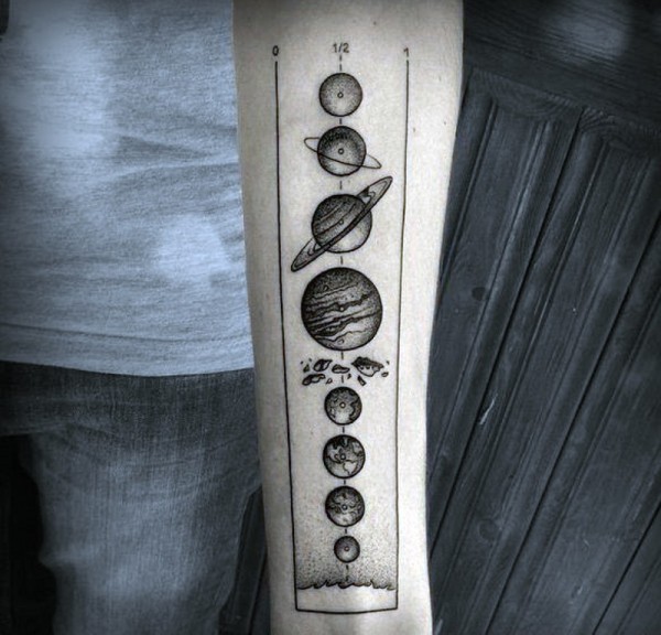 手臂上的科学风格黑白星球纹身图案