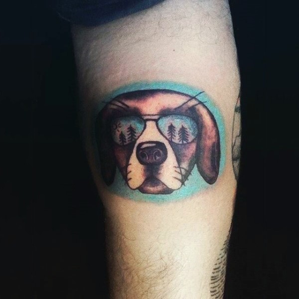 手臂很酷的卡通彩色狗和太阳眼镜纹身图案