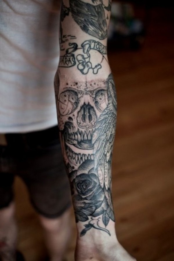 手臂简单的黑色点刺骷髅与玫瑰纹身图案