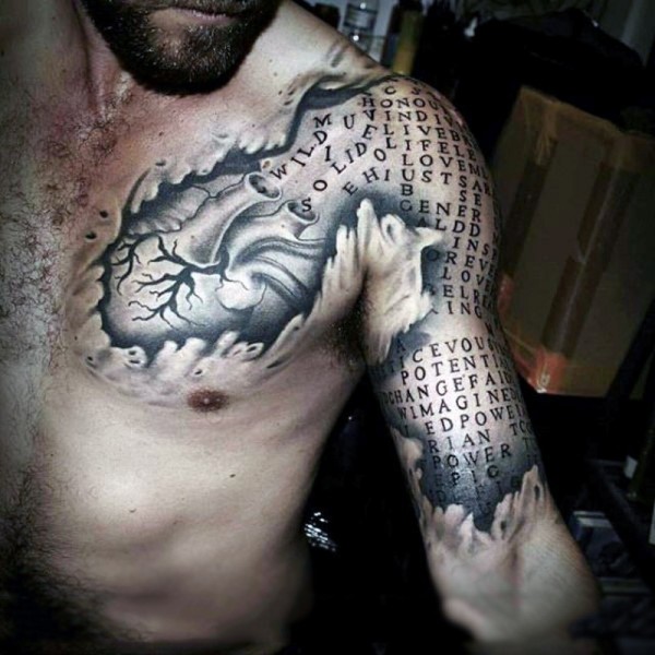 半甲独特的黑色心脏与英文字母撕皮纹身图案