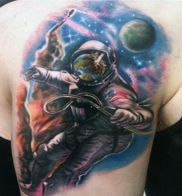 大臂七彩太空行星和宇航员纹身图案
