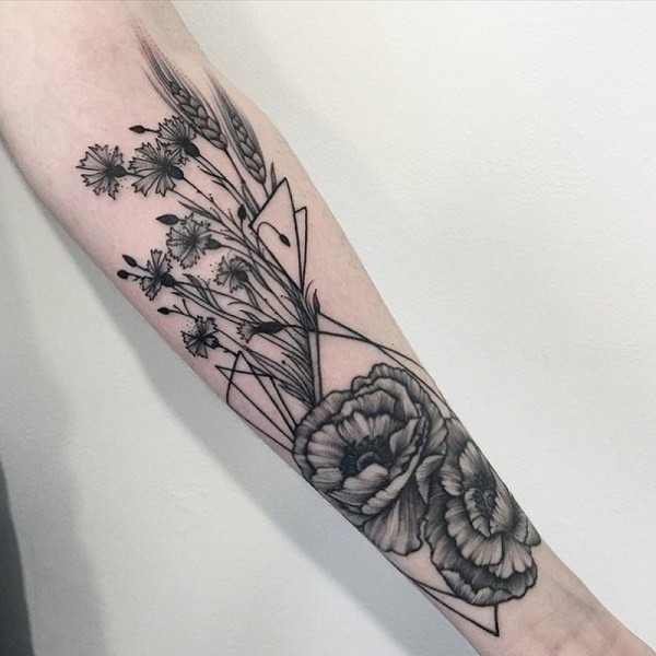 手臂手绘风格黑色的花朵纹身图案