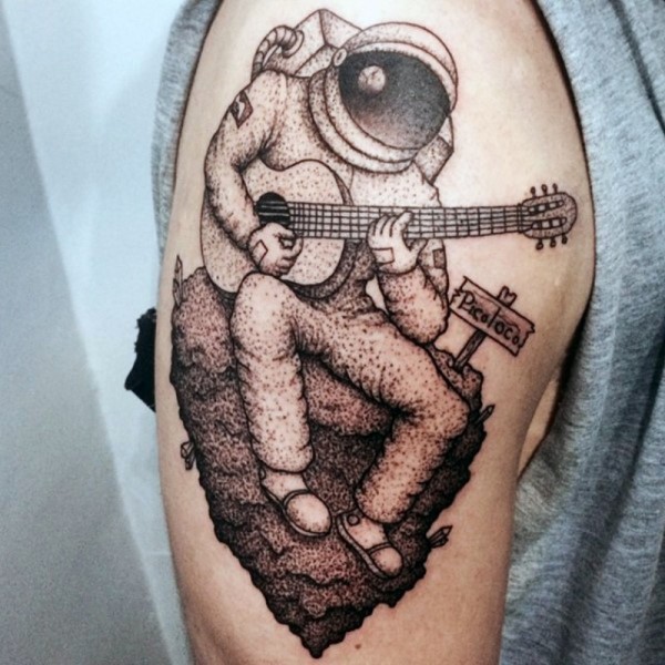 手臂简单的黑白点刺宇航员玩吉他纹身图案