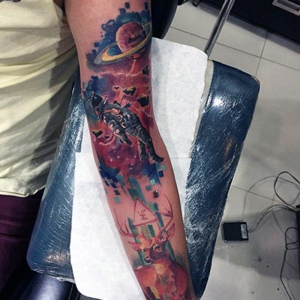 手臂优雅的彩绘太空主题和小鹿纹身图案