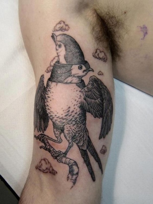 手臂奇妙的黑色鸟与两个头部纹身图案