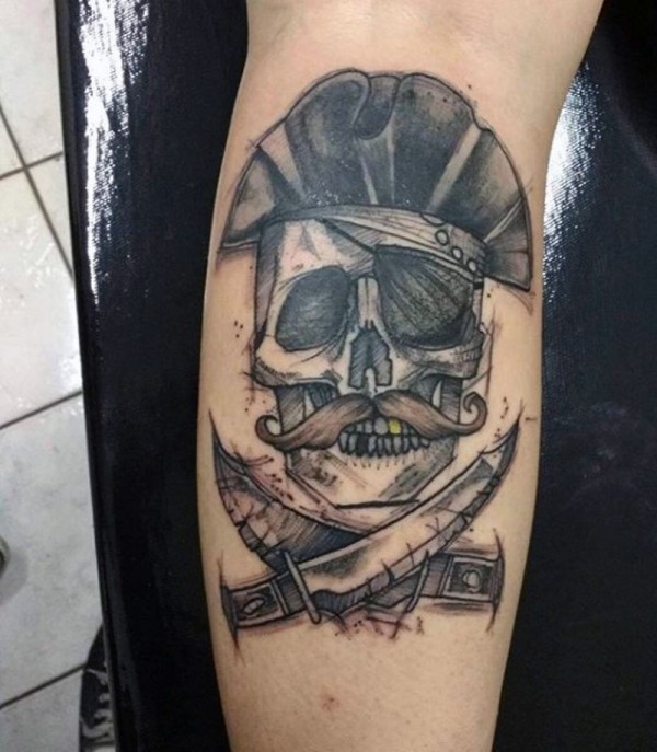 手臂黑白海盗骷髅与黄金牙齿和匕首纹身图案