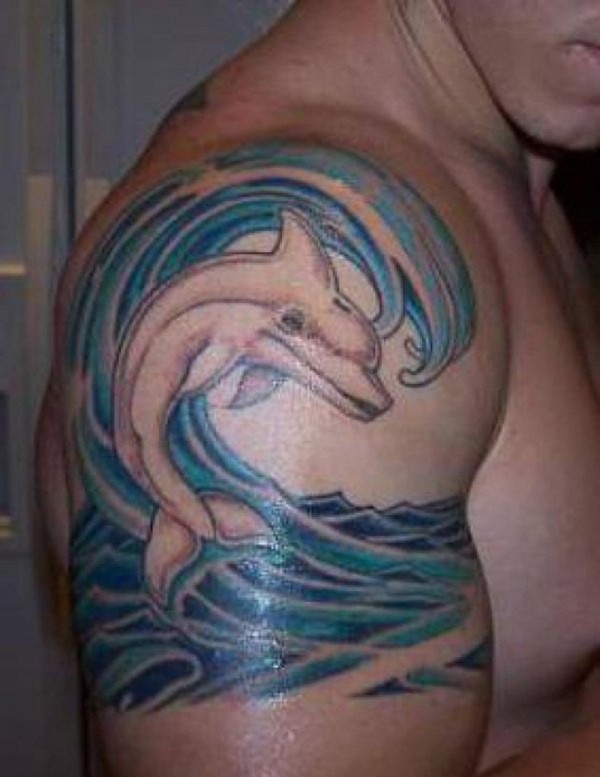 卡通风格彩色小海豚和海浪手臂纹身图案