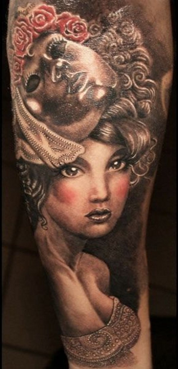 手臂惊人的女生肖像和面具彩绘纹身图案