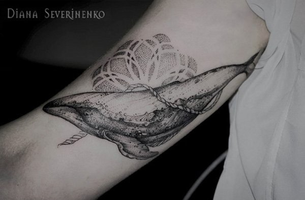 手臂原始风格的黑白大鲸鱼花卉纹身图案